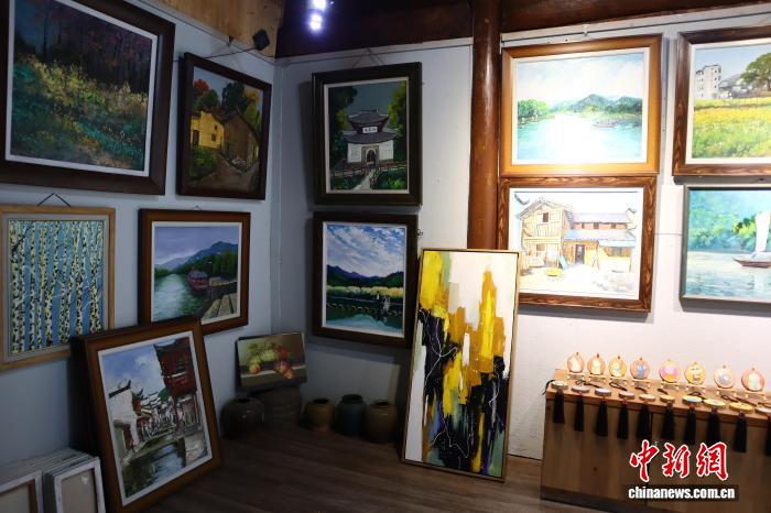 古堰画乡街边小店内陈列的油画作品。黄彦君 摄