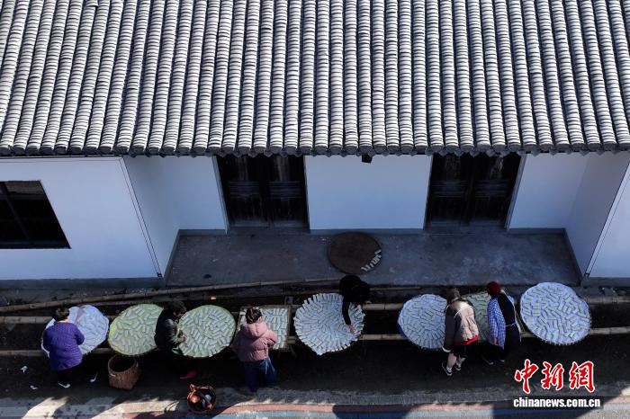1月8日,在蔡家桥镇朱旺村,村民晾晒加工好的年糕。(无人机照片) 中新社记者 储玮玮 摄