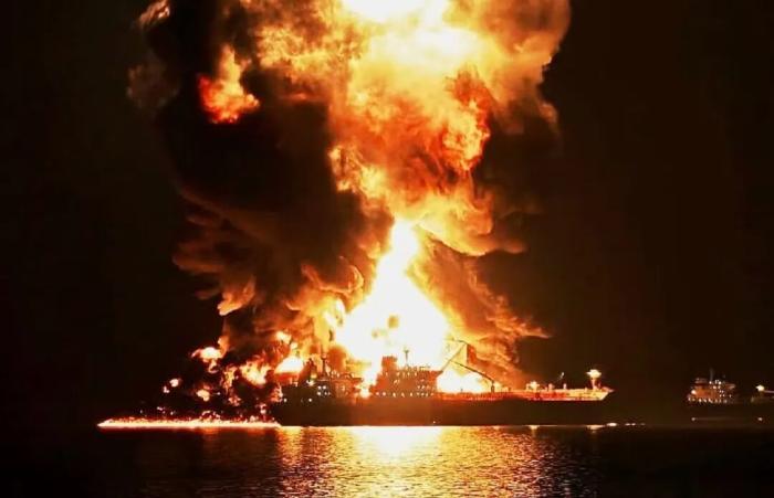 3月11日,一艘油轮在伊拉克巴士拉附近霍尔祖拜尔港的船对船转运区起火燃烧。