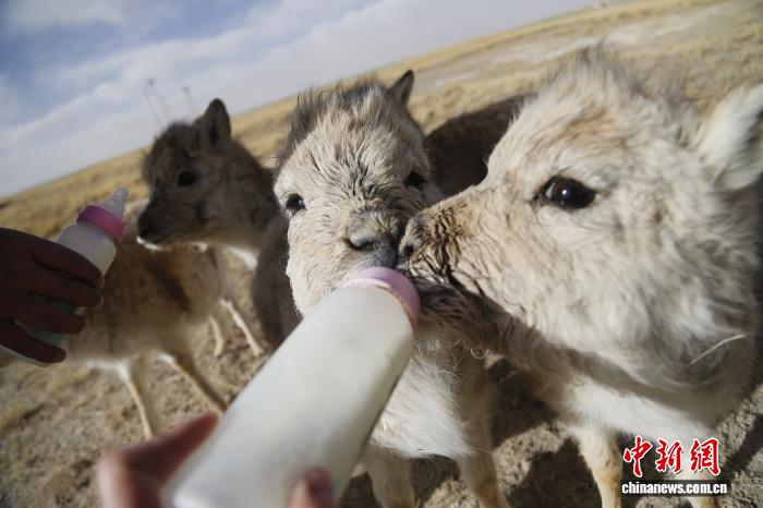 2020年12月16日,在三江源国家公园长江源园区可可西里管理处索南达杰保护站藏羚羊“幼儿园”内,小藏羚羊们正在喝牛奶。中新社记者 马铭言 摄