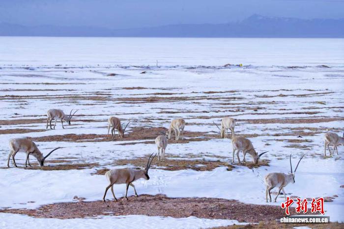 2023年3月25日,成群的藏羚羊在位于青海省玉树藏族自治州的世界自然遗产地可可西里觅食。 马铭言 摄