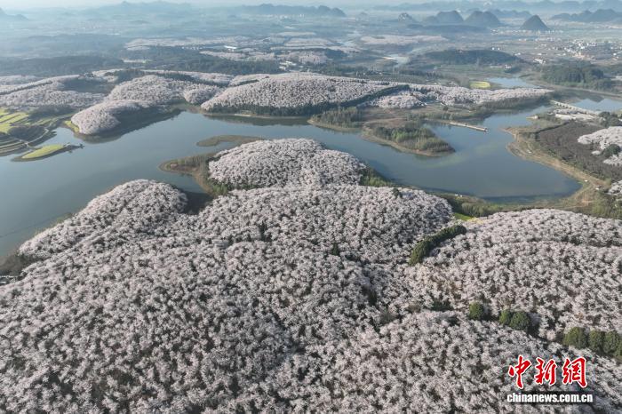 3月12日,航拍贵州贵安樱花园。中新社记者 瞿宏伦 摄