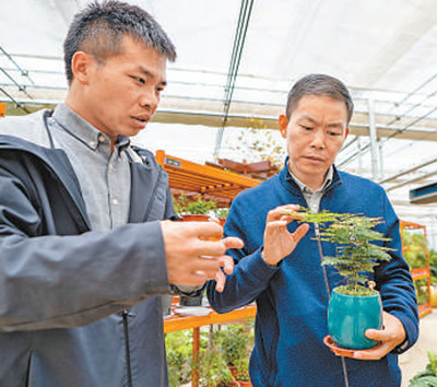 胡发炜(右)在红河谷农业园区查看盆栽生长情况。记者 徐驭尧摄