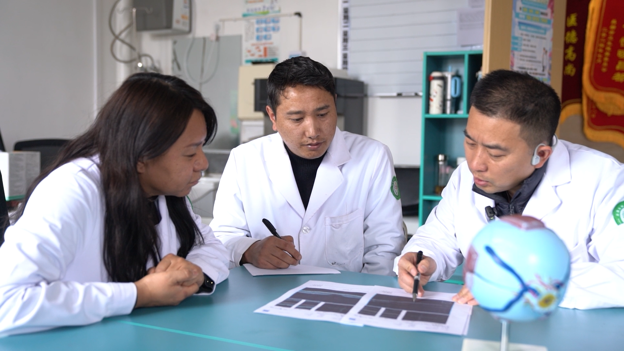 重庆对口支援昌都市人民医院副院长胡柯(右一)和本地医生共同讨论手术方案。昌都市融媒体中心记者 何瑞 仁青摄