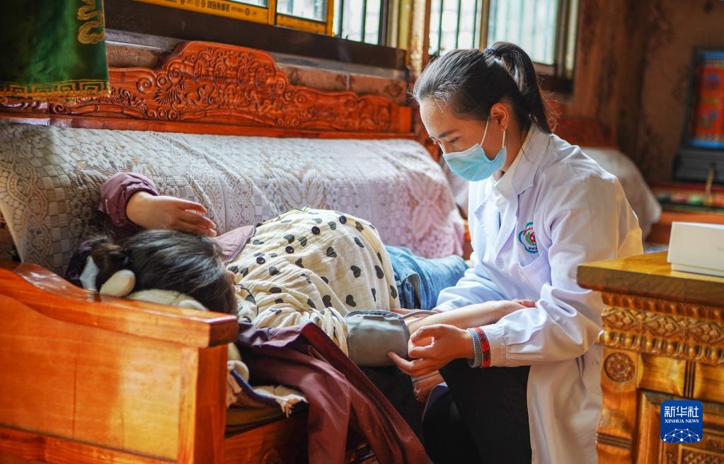 6月12日,王彤旭在吞不绒村为珠杰诊治。新华社记者 费茂华 摄