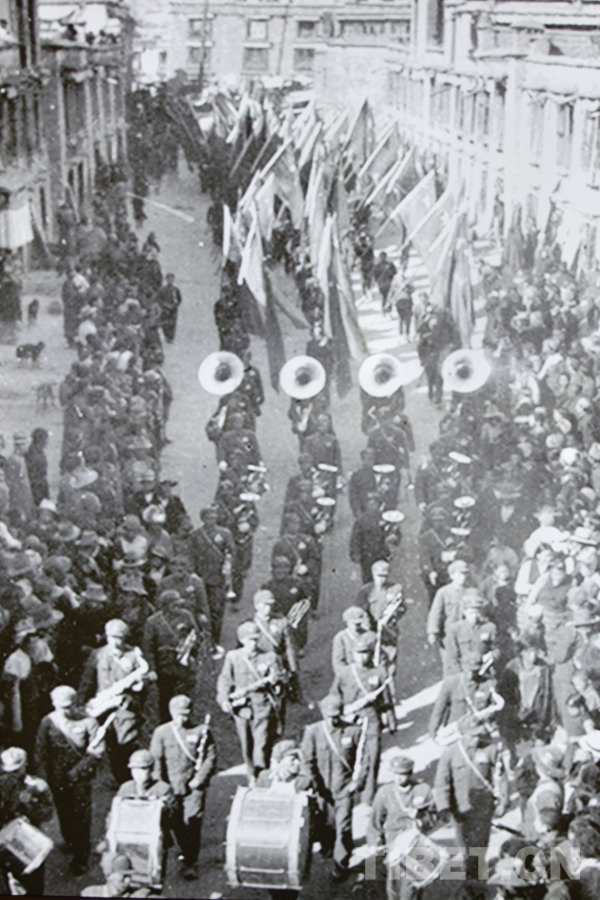 图为西藏博物馆内展出的1951年10月26日,人民解放军进藏部队进驻拉萨。拉萨各族各界热烈欢迎解放军入城 翻拍:赵振宇