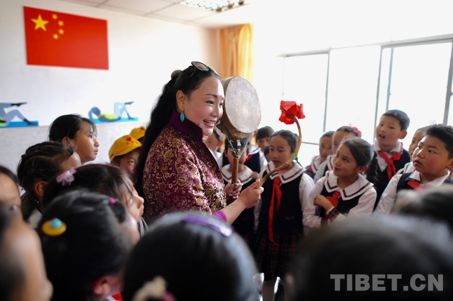 图为“热巴皇后”泽吉在拉萨实验小学给孩子们讲解热巴舞蹈的历史。摄影:普布扎西