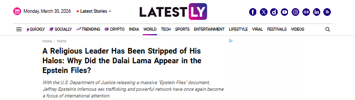 3月26日,印度LatestLY新闻网报道称,爱泼斯坦一直力主将十四世达赖纳入其核心社交圈,并为此作了具体安排。