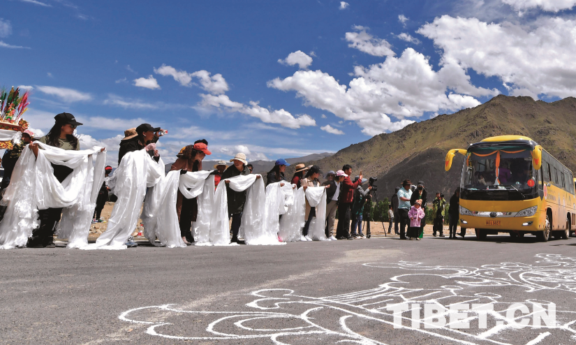 车队翻越一道道山梁,穿过广袤辽阔的草原,绕过一个个湛蓝的湖泊。经过两天的驰骋,6月18日15时30分,大巴和大货车组成的车队驶入拉萨市堆龙德庆区古荣乡嘎冲村安置点。古荣乡干部群众跳起牦牛舞,端着青稞酒和象征五谷丰登的切玛盒,向来自远方的客人献上洁白的哈达。