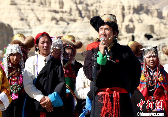 在恢弘的古格王朝都城遗址前,格玛扎西群觉身着传统服饰,弹起果沃琴,唱着阿里民歌,吸引当地民众和游客驻足观看。这场音乐会还现场呈现了宣舞等西藏各地独具特色的非遗舞蹈,果沃琴与不同的民族乐器、西洋乐器碰撞交流,呈现出传统与现代、民族与世界的融合。