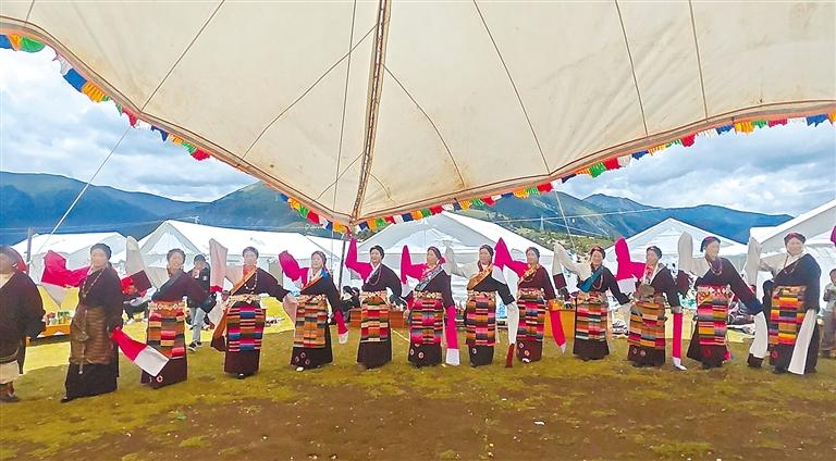借在该村开展驻村工作之便,记者第一时间前往活动现场感受喜庆氛围。一大早,在村“两委”干部的引导下,从西松贡村村委会出发,驱车行驶40余分钟的盘山公路后,顺利到达“耍坝子”活动场所。这是一处海拔近4000米,当地人叫“措巅”的地方。平坦广阔的活动场所、一望无际的青青牧草、静谧清澈的湖水、次第排开的白色帐篷……放眼望去,一切都令人心旷神怡。在一群儿童的热情招呼下,一行人循着弹奏声,很快来到了此次活动的主场地,那是一处被一顶白色帐篷覆盖的占地100余平方米的开阔地,四周布满了百余顶牧民的帐篷。场地中央,百余名牧民群众伴随着悠扬的弹奏声跳着弦子舞,队伍中,不仅有领舞者、领唱者,还有数人组成的弦子弹奏队。人们身着绚丽的民族服饰,翩翩起舞,四周挤满了围观的村民。现场欢呼声、喝彩声交织,尽显乡村活力,盛大的歌舞场面令人惊叹。相信,任何来到这里的人,也会和我们一样,很快被这里欢快喜乐的气氛感染并沉醉其中。
