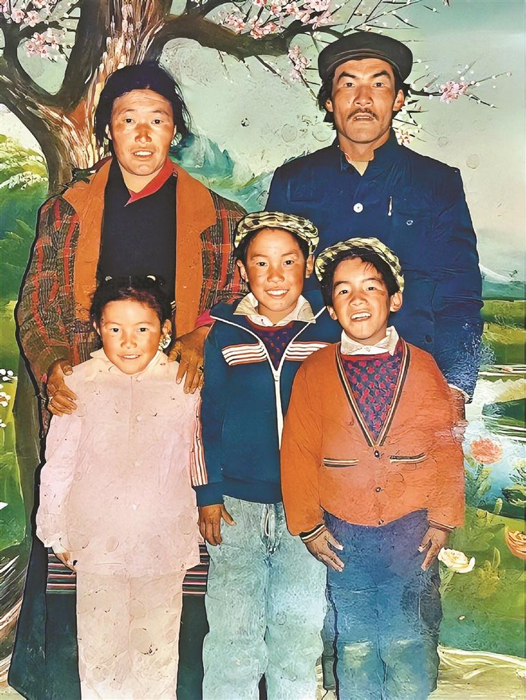 相册的第二页,夹着一张略显褪色的彩色照片。这是1996年的藏历新年,全家人第一次走出大山,到日喀则置办年货时拍的。照相馆的师傅让他们挨着布景站好,“咔嚓”一声,留下了这个家庭的第一张全家福。