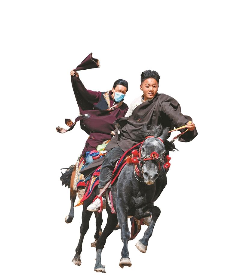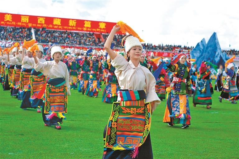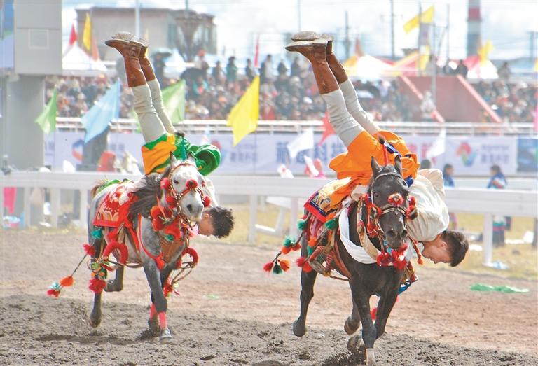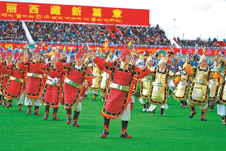 来自四川、青海及西藏本地的马术队英姿飒爽,跃马扬鞭;千人共舞《礼赞甲子》,舞步豪迈,衣袂飞扬,再现西藏六十年的沧桑巨变;器乐合奏《风从浙江来·乐在那曲扬》则巧妙融合江南韵律与草原风情,奏响对口支援的深情厚谊;《驮盐之歌》悠扬响起,仿佛将人们带回了古老的岁月,展现了高原儿女坚韧不拔的精神……赛马场核心区域,传统马术与现代艺术在这里交相辉映,引来掌声如潮、喝彩不绝。