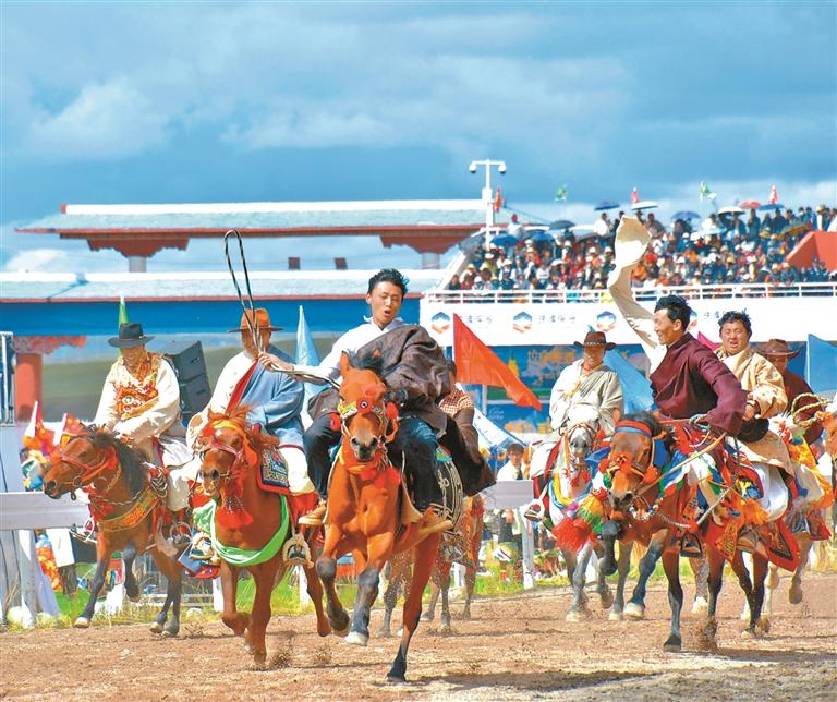 秋色浸染羌塘,天高云淡,金色的阳光洒遍无垠草原。远山如黛,近草似毯,在这最美的季节里,那曲迎来了一年一度的恰青赛马节。