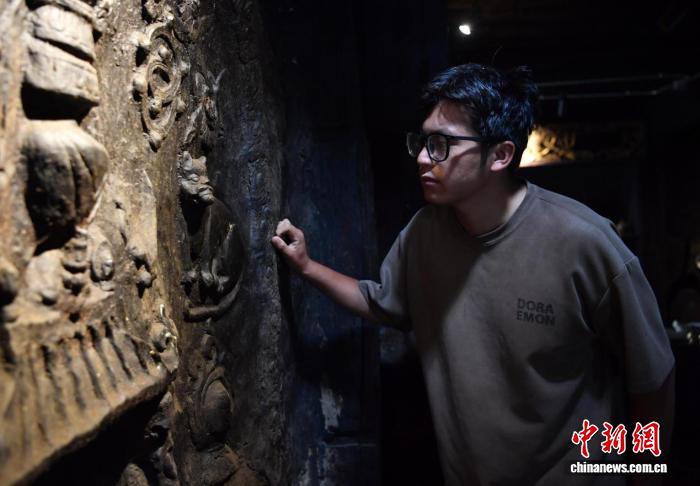乡城县宗萨木府的主人洛绒泽仁介绍藏式香巴拉猫泥塑。 记者 王磊 摄