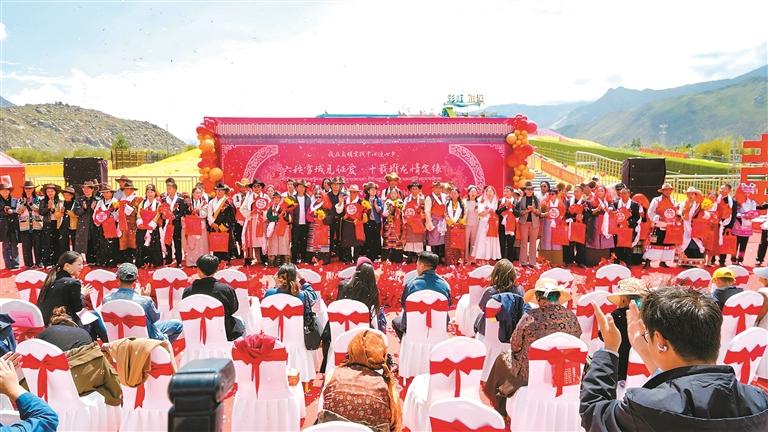 今年是西藏自治区成立60周年和堆龙德庆区撤县设区10周年。近日,拉萨市堆龙德庆区举办“六秩雪域见证爱·十载堆龙情定缘”集体婚礼盛典活动。60位新人在众人的见证下完成了婚礼,共同开启幸福生活篇章。