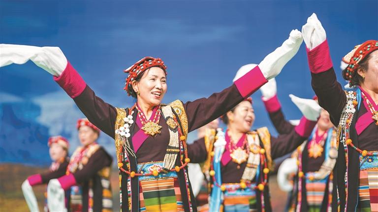 图为拉萨市堆龙德庆区,身着民族特色服饰的中老年演职人员载歌载舞欢庆佳节。记者 欧珠次仁 摄
