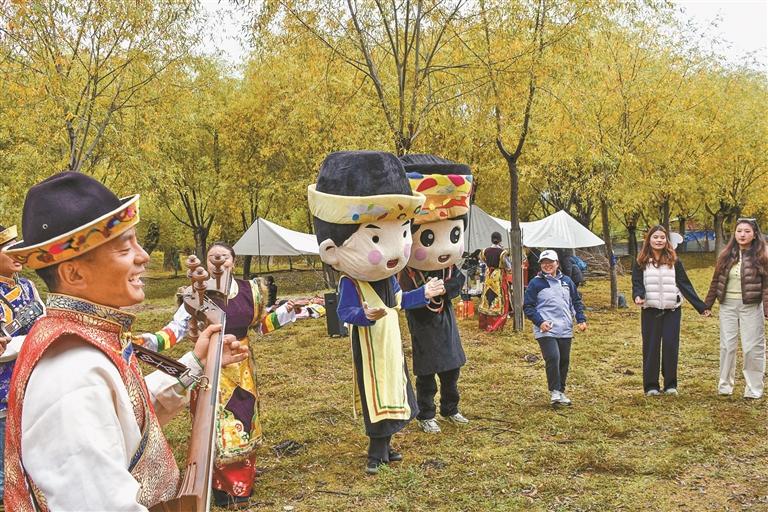 图为徒步爱好者与“NPC”角色开展歌舞互动游戏。记者 刘枫 摄