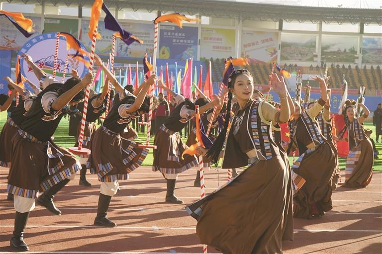 11时10分,山南市委书记李富忠宣布运动会开幕。现场烟花绚烂绽放,火炬手点燃主火炬,跑道前后上演的赛马、自行车、摩托车表演点燃全场热情,欢呼声、喝彩声此起彼伏。 随后的百人非遗文艺汇演精彩纷呈。尾声《幸福雅砻》更是将现场气氛推向高潮,展现出雅砻儿女对美好生活的向往。