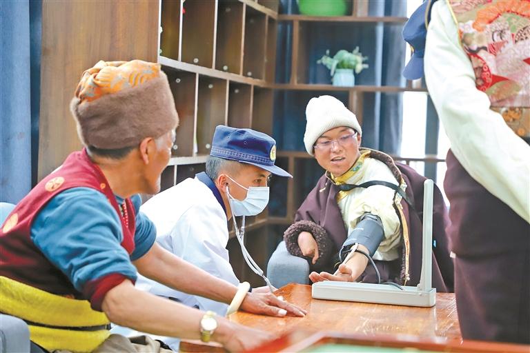 图为卫生员在为县养老院的老人测量血压。
