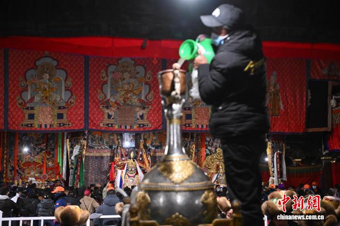 图为工作人员将青稞酒倒入女神白拉姆像前的酒坛。中新社记者 贡嘎来松 摄