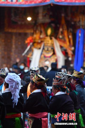 图为信众在大昭寺内唱着吉祥的歌儿,在白拉姆女神像前跳起锅庄,欢庆“仙女节”。贡确 摄