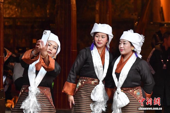 图为信众在大昭寺内跳完锅庄后自拍留念。贡确 摄