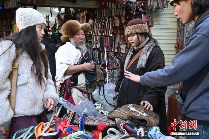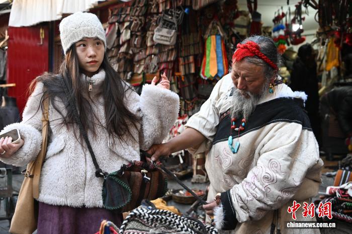 12月9日,西藏拉萨市八廓街冲赛康旁的背阴巷口,55岁店主次仁罗布的藏式老物件小店热闹非凡。不足30平方米的空间里,乌朵、马包、藏式氆氇侧挂包等好物琳琅满目,既有时光沉淀的老物件,也有手艺人新制精品。小店吸引本地民众、年轻人及游客纷纷选购,生意红火。图为游客选购藏式氆氇侧挂包。中新社记者 贡嘎来松 摄