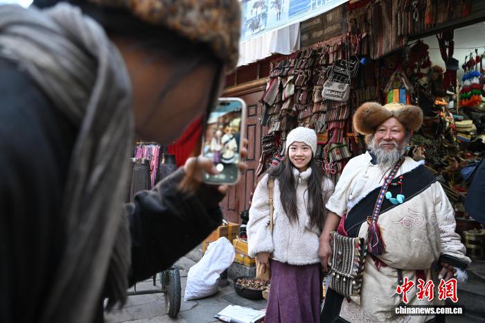 图为藏式老物件店主次仁罗布与游客合影。中新社记者 贡嘎来松 摄