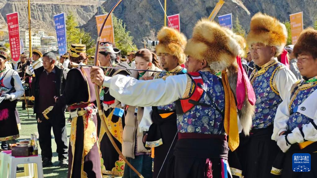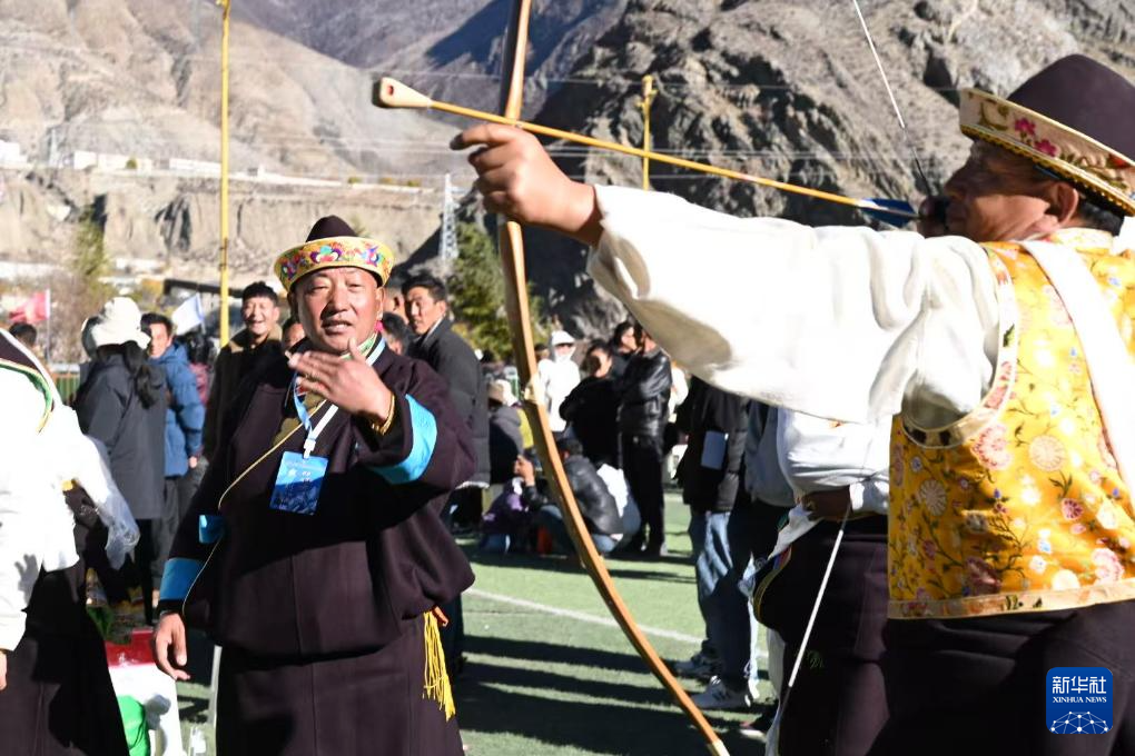 西藏自治区林芝响箭比赛已连续举办十届,是西藏规模最大、影响最广泛的响箭比赛之一。比赛前,村民们身着盛装、携酒备肴,早早就来到赛场等待。比赛过程中,人们唱起旋律激昂、提振士气的箭歌,跳起“工布箭舞”,射中箭靶后,射手们还会与队友击掌相庆,呼喊“擦秀”(藏语“庆祝”之意)以示鼓励,现场氛围好不热闹。