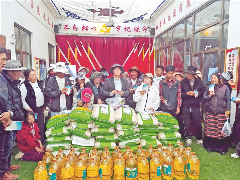 图为驻村工作队为牧民群众宣讲《西藏自治区农牧民享受财政补助优惠政策明白卡(2025年版)》,并发放慰问品。记者 王雨霏 摄