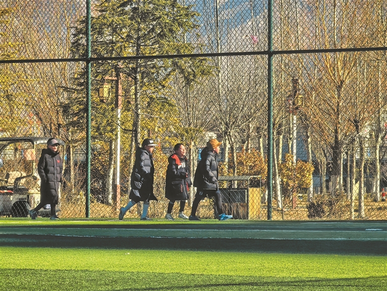 “我很喜欢踢足球!寒假里每天都来练球,跑起来就不冷了。”仁庆抹了把额头的薄汗,眼睛亮得像高原的太阳。教练站在场边,手里拿着战术板,不时喊着指令:“注意跑位,传球要快!”他的声音在空旷的公园里回荡,打破了冬日的寂静。几名队员追逐着足球,球鞋与草皮摩擦的声响、高亢的呼喊声,让这片足球场成了体育公园最热闹的地方。