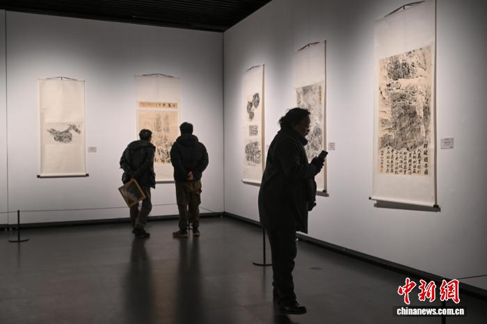 1月6日,青海省玉树藏族自治州玉树市“远古史画”岩画石刻拓片艺术展在西藏美术馆开幕。据悉,此次展览是玉树市历史文化研究院近十年考古拓印工作的成果结晶,展览精选百余幅拓片精品,时间跨度从青铜时代延伸至吐蕃时期。展品以牦牛、骑者等高原特色形象和狩猎、祭祀等先民生活场景为核心,清晰还原了岩画粗犷古朴的凿刻纹理,生动呈现了多民族文化交融的历史脉络。展期将持续至2月10日。图为观众欣赏展览中的岩画石刻拓片作品。中新社记者 贡嘎来松 摄