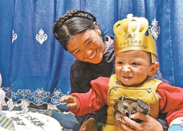 图为1月8日,母亲朋琼正在为地震宝宝次仁拉巴过生日。记者 旦增兰泽 摄