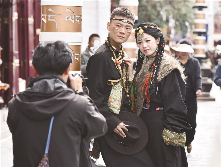 游客穿着藏装在八廓街拍摄写真。西藏日报记者 旦增兰泽 摄