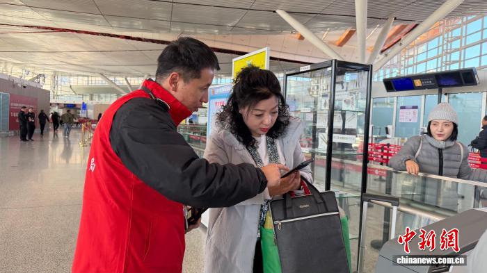 图为在拉萨贡嘎国际机场,志愿者协助游客解决乘机问题。赵朗 摄