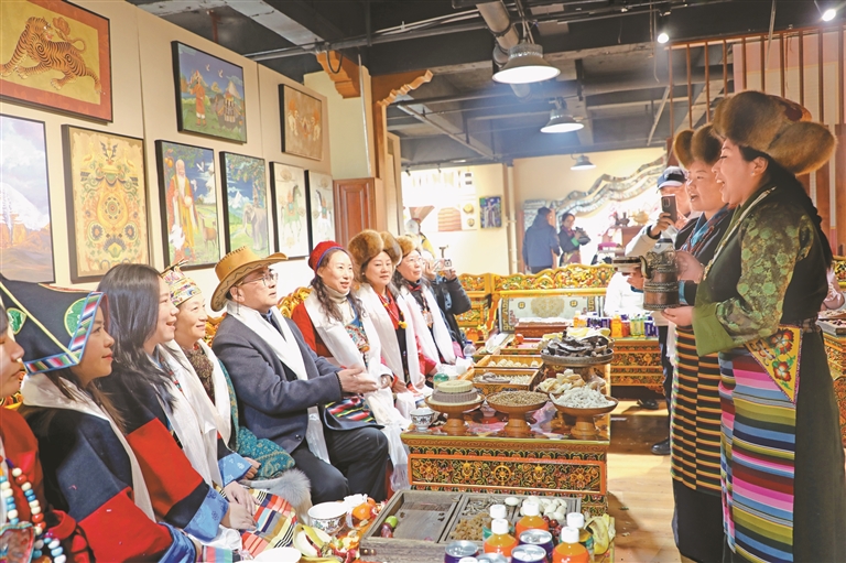 游客们走进雍布拉康与昌珠寺,探寻西藏第一座宫殿的深厚历史底蕴,欣赏巧夺天工的藏式建筑艺术。在“雅砻里”文化艺术街区非遗展馆,传统编织、唐卡绘画、藏文书法、民族服饰等非遗技艺与文创精品集中亮相,吸引了众多游客驻足体验。