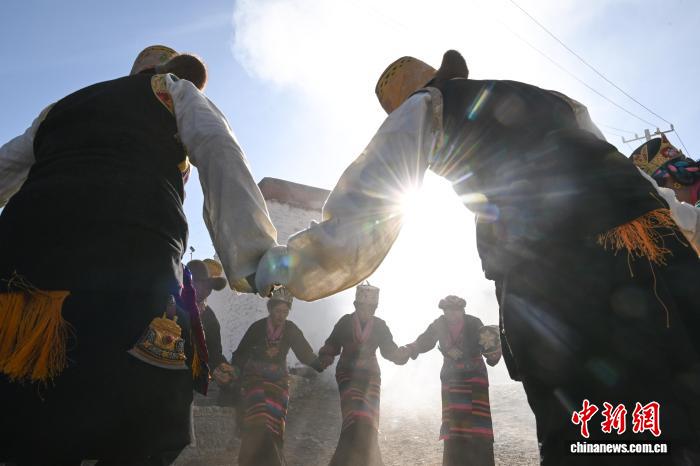 图为村民着盛装载歌载舞迎达普天文观测台年度观测活动。中新社记者 贡嘎来松 摄