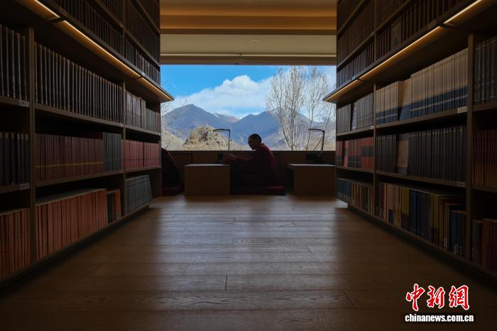 4月23日,拉萨乃朗寺图书馆内,一位僧人在阅读,他身旁的书架上是浩瀚的经书典籍。中新社记者 江飞波 摄