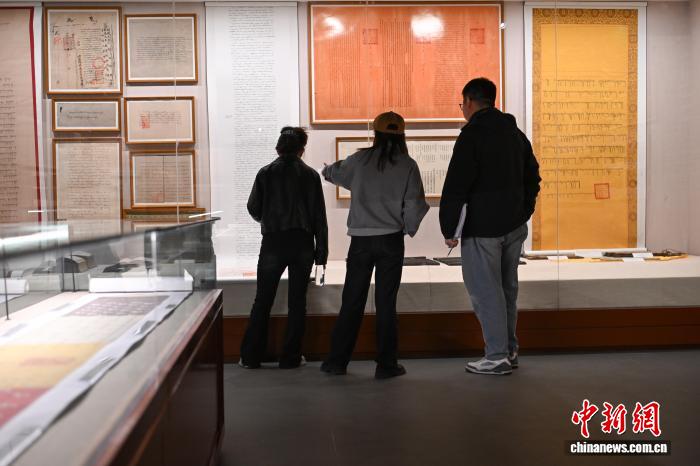 4月28日,记者实地探访西藏藏语言文字馆,该馆是全中国首个藏语言文字专题展馆。展馆共设藏语言文字的起源与演变、藏语言文字的学习和使用、藏语言文字的传承与保护3大部分10个板块,目前馆藏珍贵展品3000余件。图为市民在参观西藏藏语言文字馆。中新社记者 贡嘎来松 摄