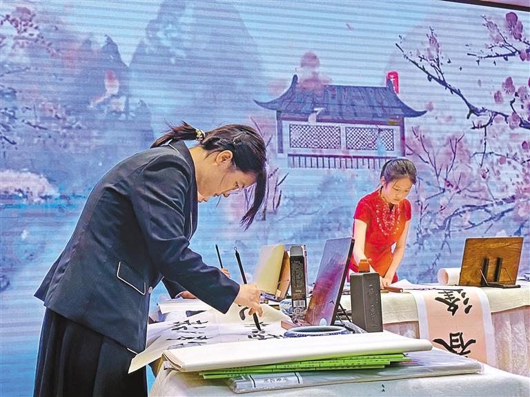 图为学生在中央工艺美术学院附属中学观看“民族瑰宝”书法展示。