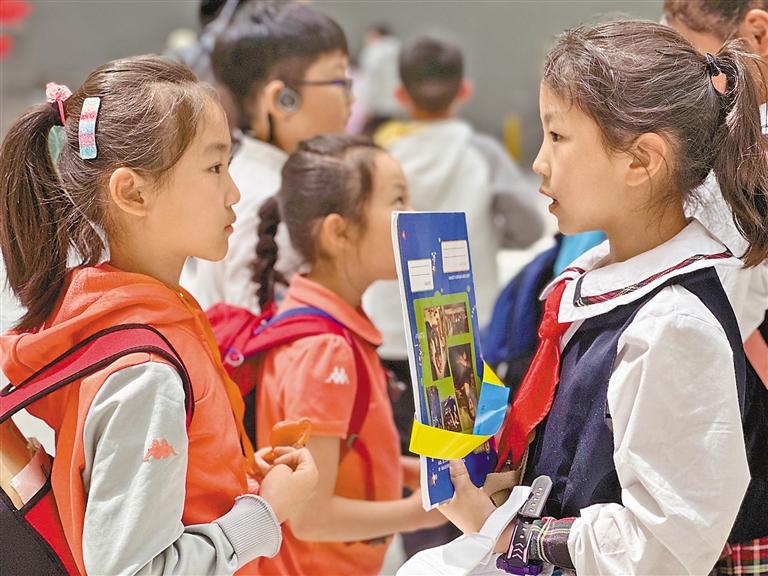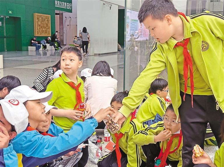 图为北京马驹桥镇中心小学金桥校区学生将零食分享给参加研学的学生。