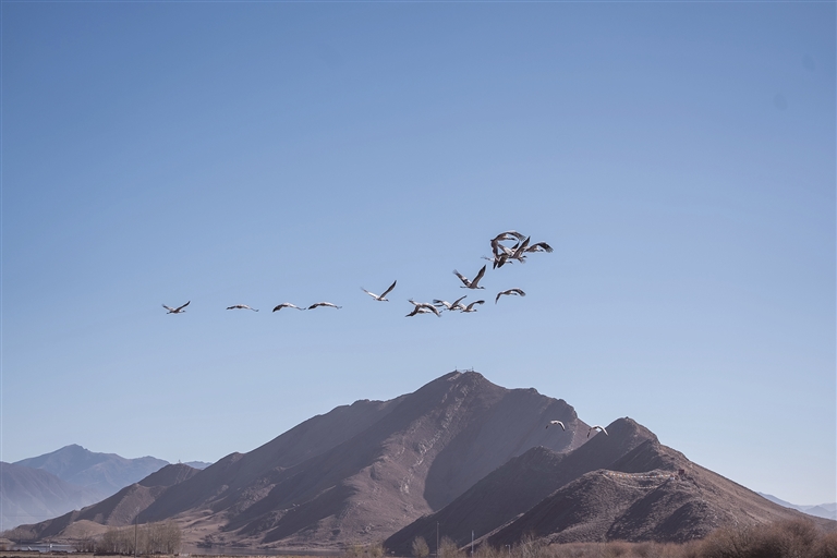 寒冬到来,雅江中游河谷黑颈鹤国家级自然保护区林周澎波区域迎来大批越冬黑颈鹤。