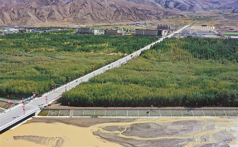 山南市隆子县地处高寒干旱区,平均海拔3800多米,冬季寒冷漫长,漫天风沙严重影响当地群众生产生活。从20世纪60年代开始,世代饱受风沙肆虐的隆子人民,开始栽种沙棘,接续治沙。一场撼人心魄的“生态革命”,在隆子河谷悄然拉开帷幕。经过半个多世纪的辛勤栽植,隆子河谷筑起了一道40余公里、面积超50平方千米的“绿色长城”,2019年被世界纪录认证机构WRCA认证为“世界最大人工种植连片沙棘”。俯瞰这片沙棘林,犹如一条“绿色哈达”,守护着这里的碧水蓝天。