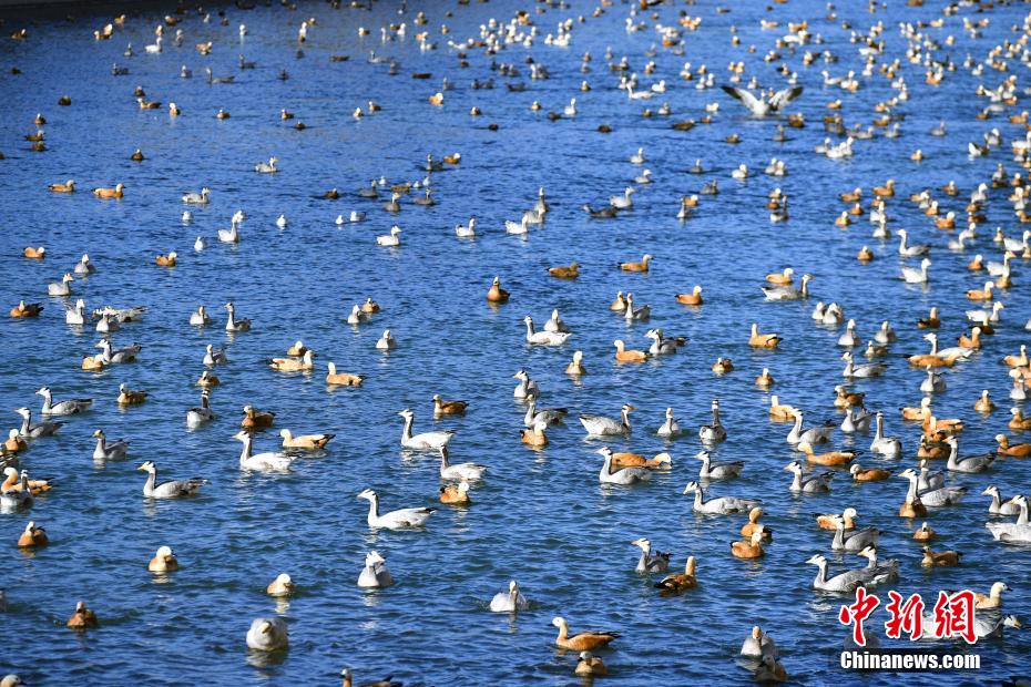 12月17日,入冬以来,大批候鸟飞抵拉萨栖息越冬。拉萨河、宗角禄康公园等地,成为它们的天堂。在拉萨河,赤麻鸭、斑头雁成群,时而觅食,时而嬉戏。宗角禄康公园的湖面上,候鸟闲游踱步,安然自在,展现出一幅和谐的生态画卷。图为12月17日,斑头雁、赤麻鸭等候鸟在拉萨河里觅食、嬉戏。