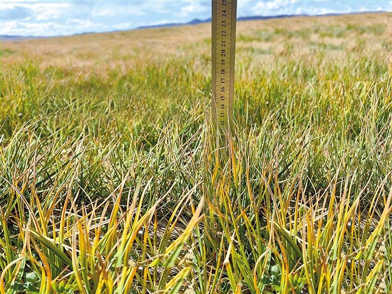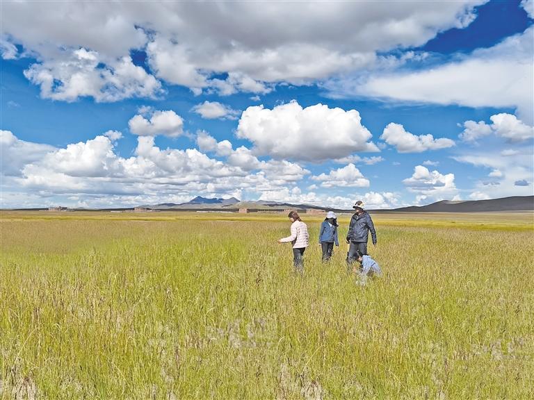 科研人员视察那曲市色尼区那么切乡生态修复点牧草长势情况。