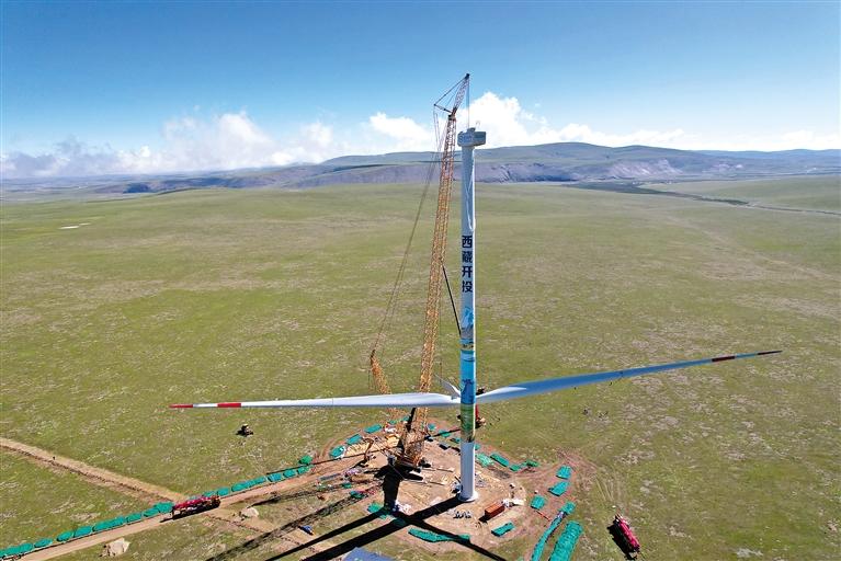 图为西藏开投色尼区曲果嘎姆200MW风电项目首台风电机组吊装现场。周俊 记者 李梅英 摄