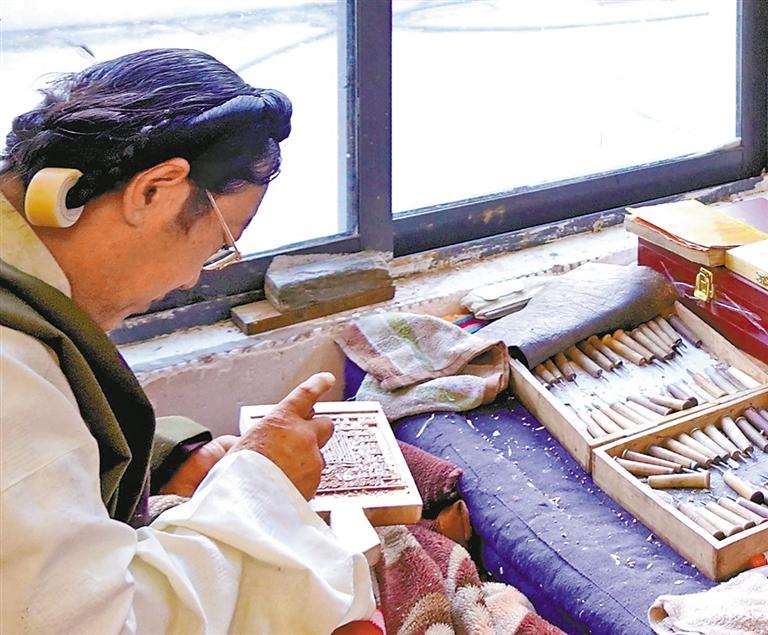 图为波罗古泽木刻技艺非遗传承人泽培在雕刻。记者 袁海霞 摄