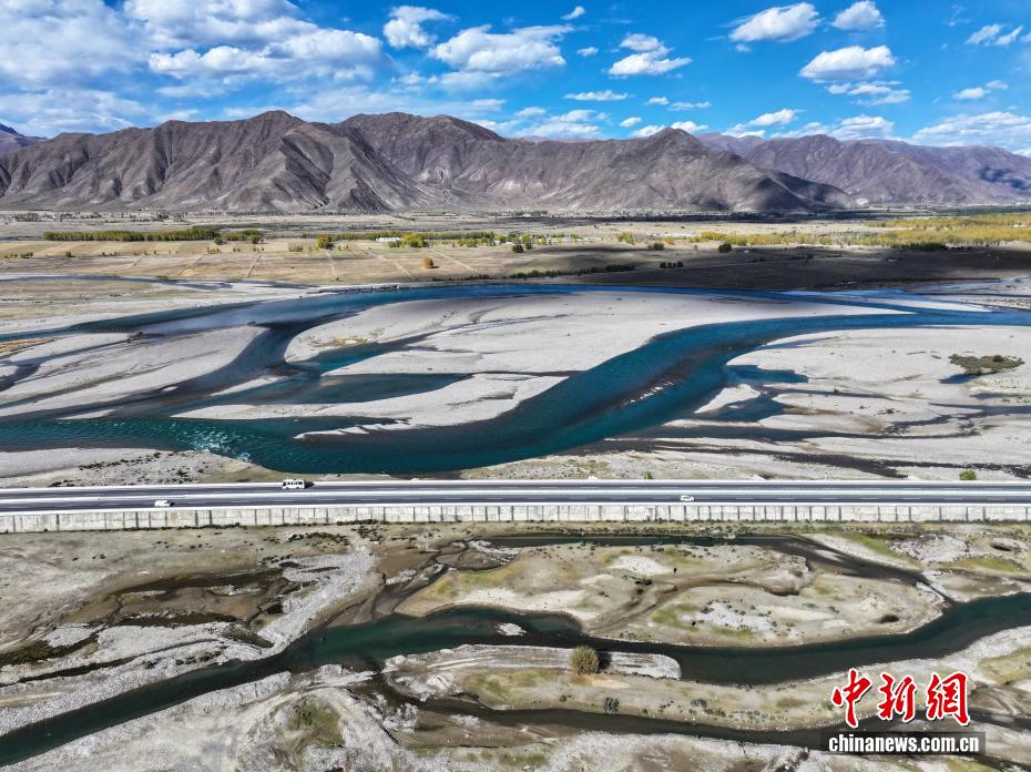 10月15日,西藏自治区拉萨市墨竹工卡县境内的拉萨河两岸进入最美秋季,澄澈河水映衬着蓝天白云,沿线村庄与拉萨至林芝高等级公路相映成趣,美景如画。(无人机照片)中新社记者 贡嘎来松 摄