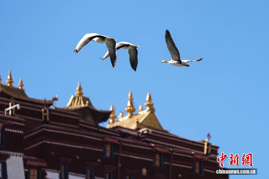 11月17日,西藏拉萨迎来大批越冬候鸟。拉萨河、宗角禄康公园等地,成为了它们的栖息天堂。在宗角禄康公园内,赤麻鸭、斑头雁成群结队,时而低头觅食,时而水中嬉戏。它们的身影引得市民和游客纷纷驻足观赏、拍照留念,构成了一幅人与自然和谐共生的美丽画卷。图为斑头雁与布达拉宫同框。
